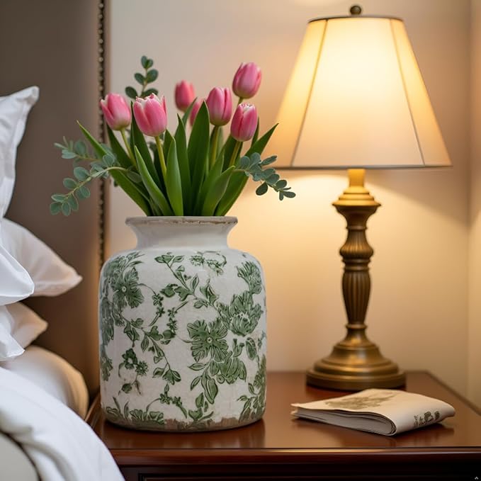 Vintage Ceramic Vase with Green Floral Pattern, White and Green, Crackle Glazed Finish, Decorative Garden Design (Medium - Vintage Round Floral Vase)
