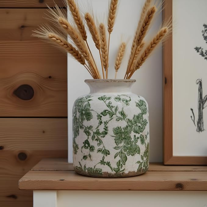- VINTAGE DESIGN: Beautiful ceramic vase featuring an elegant green floral pattern on a white background with a distinctive crackle glazed finish