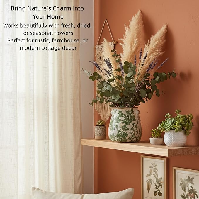 - Textured Crackle Glaze Finish: Each vase showcases a hand-painted green floral pattern with a distressed crackle glaze, creating cozy, homey vibes and a farmhouse or cottage feel that enhances any room.