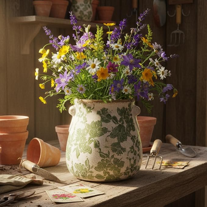 Vintage Green and White Ceramic Floral Vase Planter, Rustic Crackle Glaze Pottery Jar, Hand-Painted Floral Pot Design for Flowers or Plants, Farmhouse & Cottage Home Decor Accent