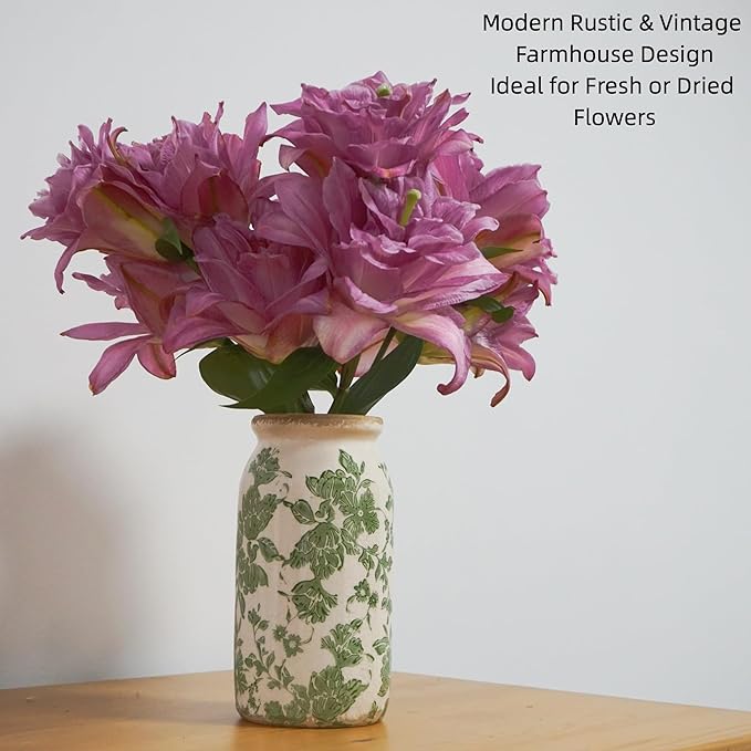Vintage Green Floral Ceramic Vase, 8 Inch Crackle Glaze Rustic Handmade Vase, Decorative Pottery for Fresh or Dried Flowers, Farmhouse Cottage Modern Rustic Decor