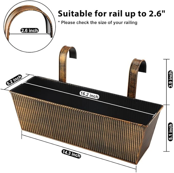 - Large Size:The railing planters measure 16" x 5.1" x 5.1", and the hook is suitable for railings up to 2.5 inches.Please check the size carefully before purchasing