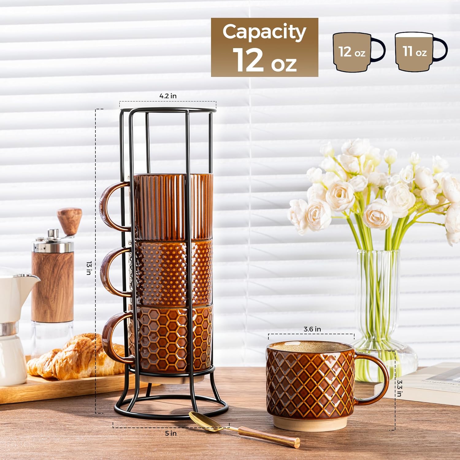 GBHOME 12OZ Stackable Coffee Mugs with Stand, Ceramic Coffee Mugs with Texture Patterns for Man,Woman,Dad,Mom, Modern Coffee Cups Set of 4 for Latte/Cappuccino. Dishwasher&Microwave Safe, Caramel