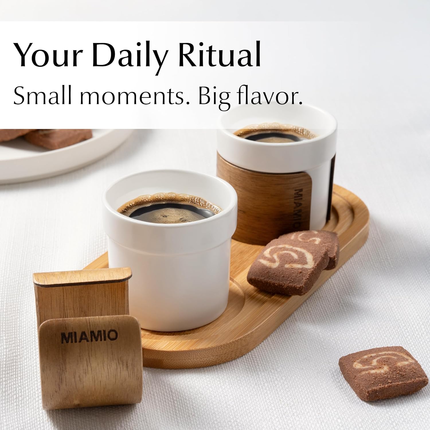 - πππ π ππ πππ πππ β The minimalist yet sophisticated design blends smooth ceramic with warm acacia wood. Inspired by the Japandi aesthetic, these cups offer a modern, clean look, making them a stylish addition to any kitchen. The delicate MIAMIO logo engraved on the wooden cuff further elevates the design. They are perfect for enhancing your espresso accessories or as an addition to your Japanese tea set.