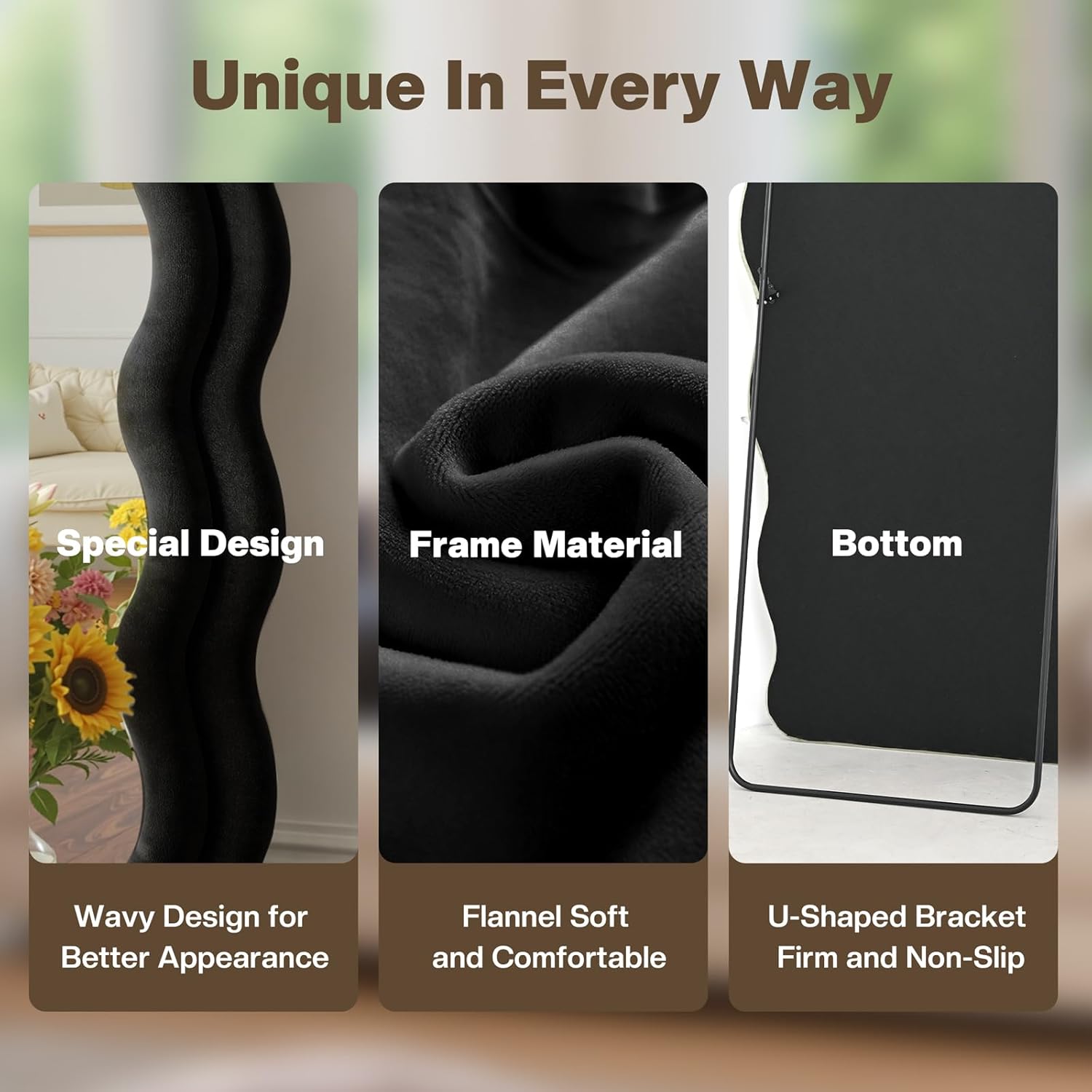 Full Length Mirror 71"x30" Irregular Wavy Full Body Wall Mounted Floor Mirror with Stand Black Flannel Frame Leaning Hanging Wall for Bedroom Entrance Hallway