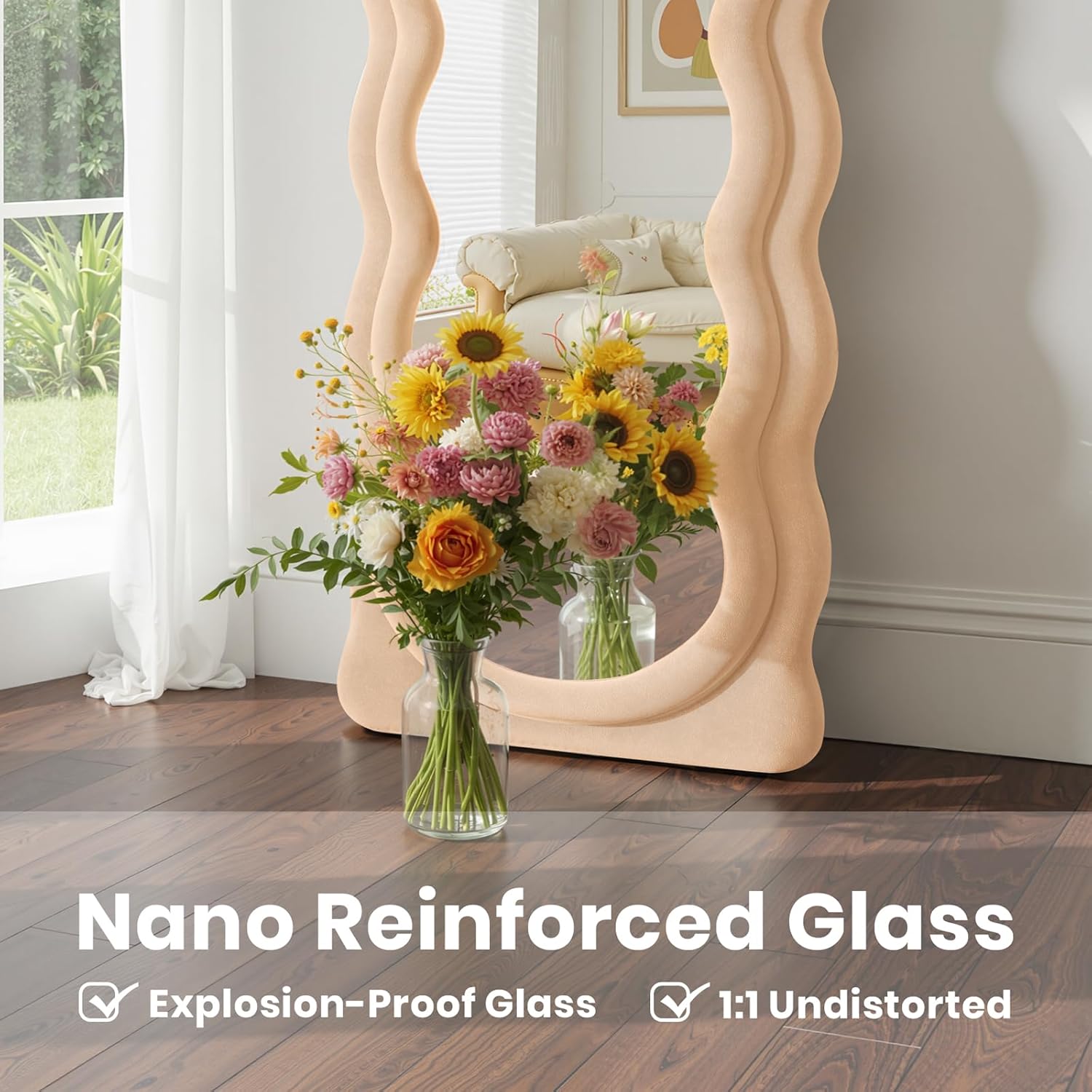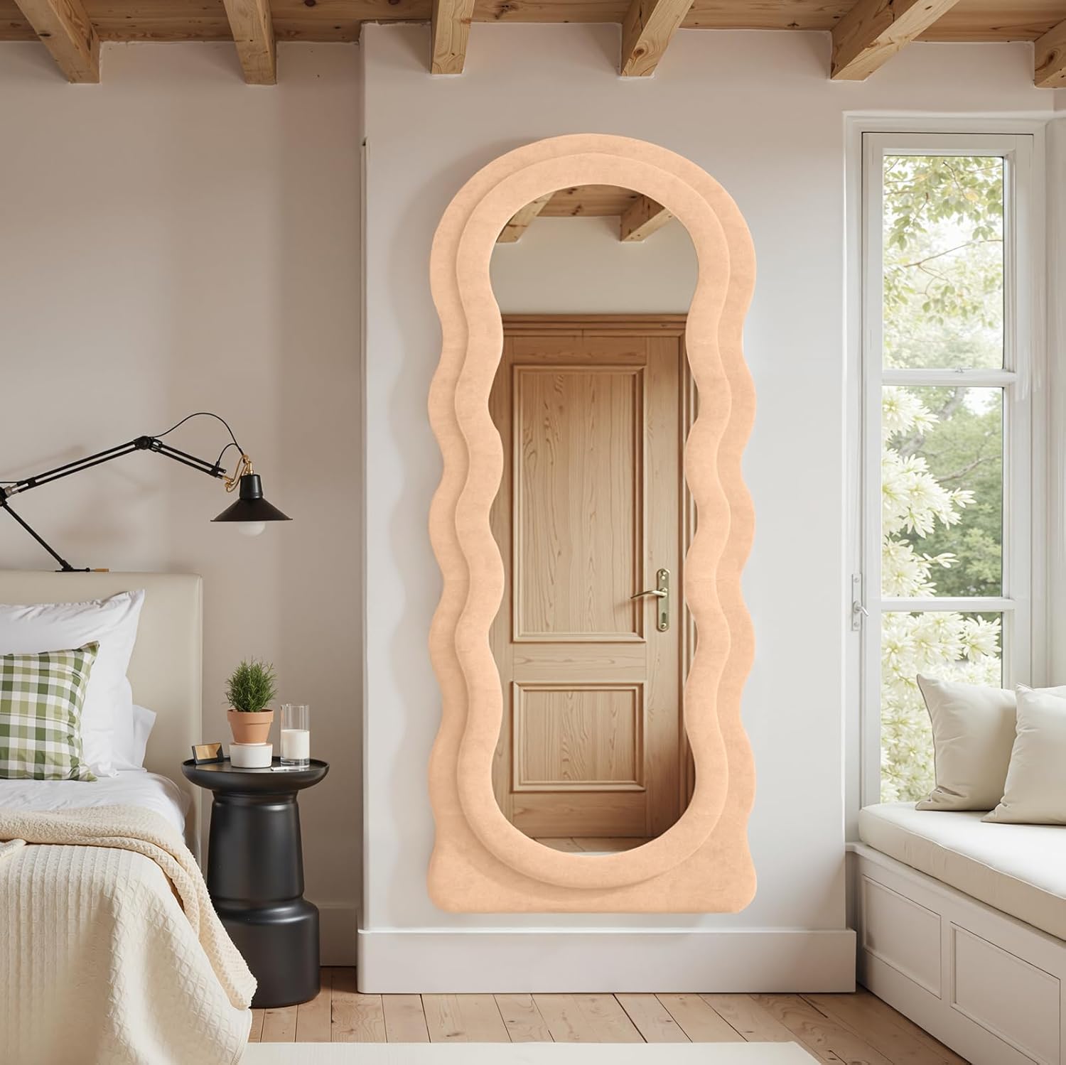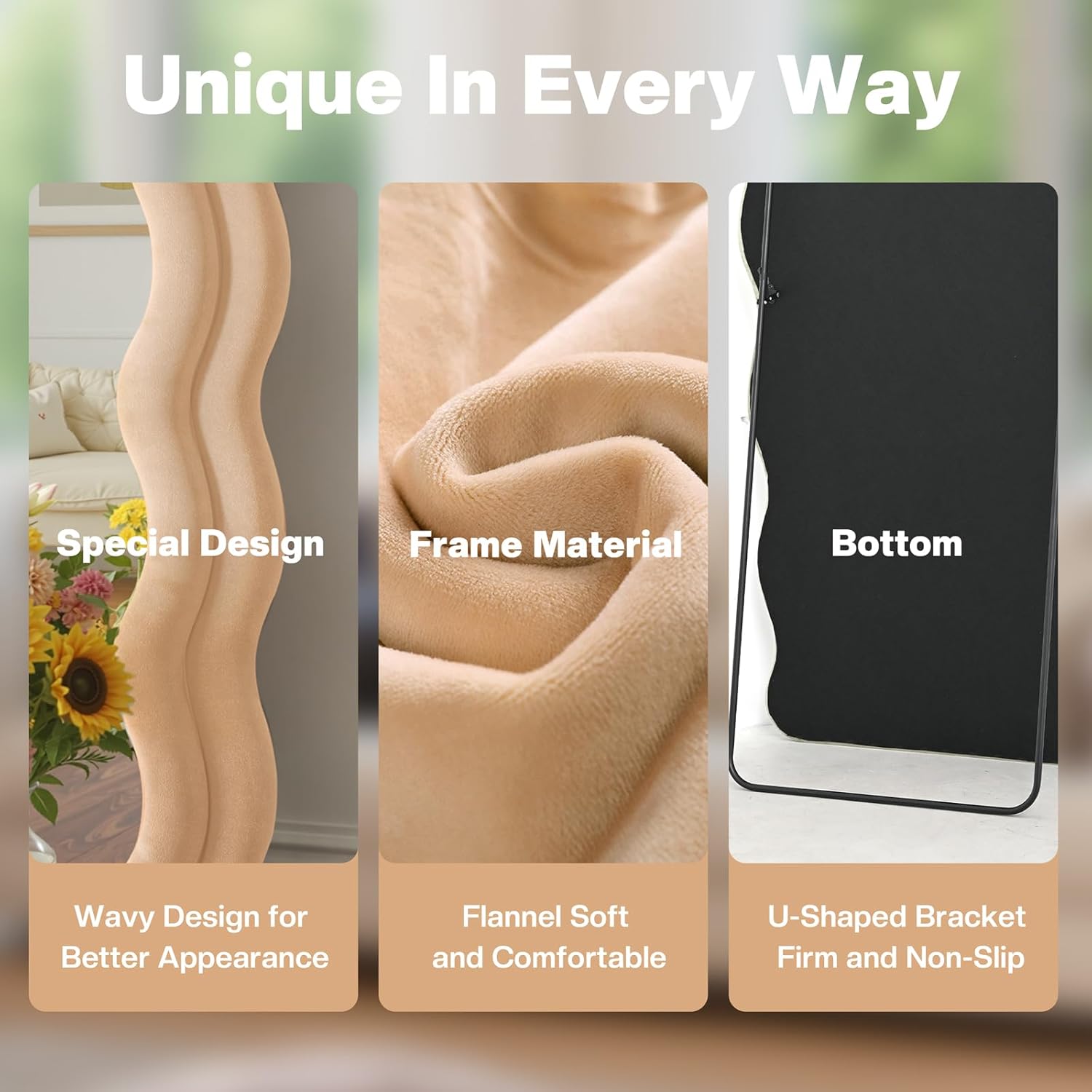 Full Length Mirror 71"x30" Irregular Wavy Full Body Wall Mounted Floor Mirror with Stand Milk Tea Flannel Frame Leaning Hanging Wall for Bedroom Entrance Hallway