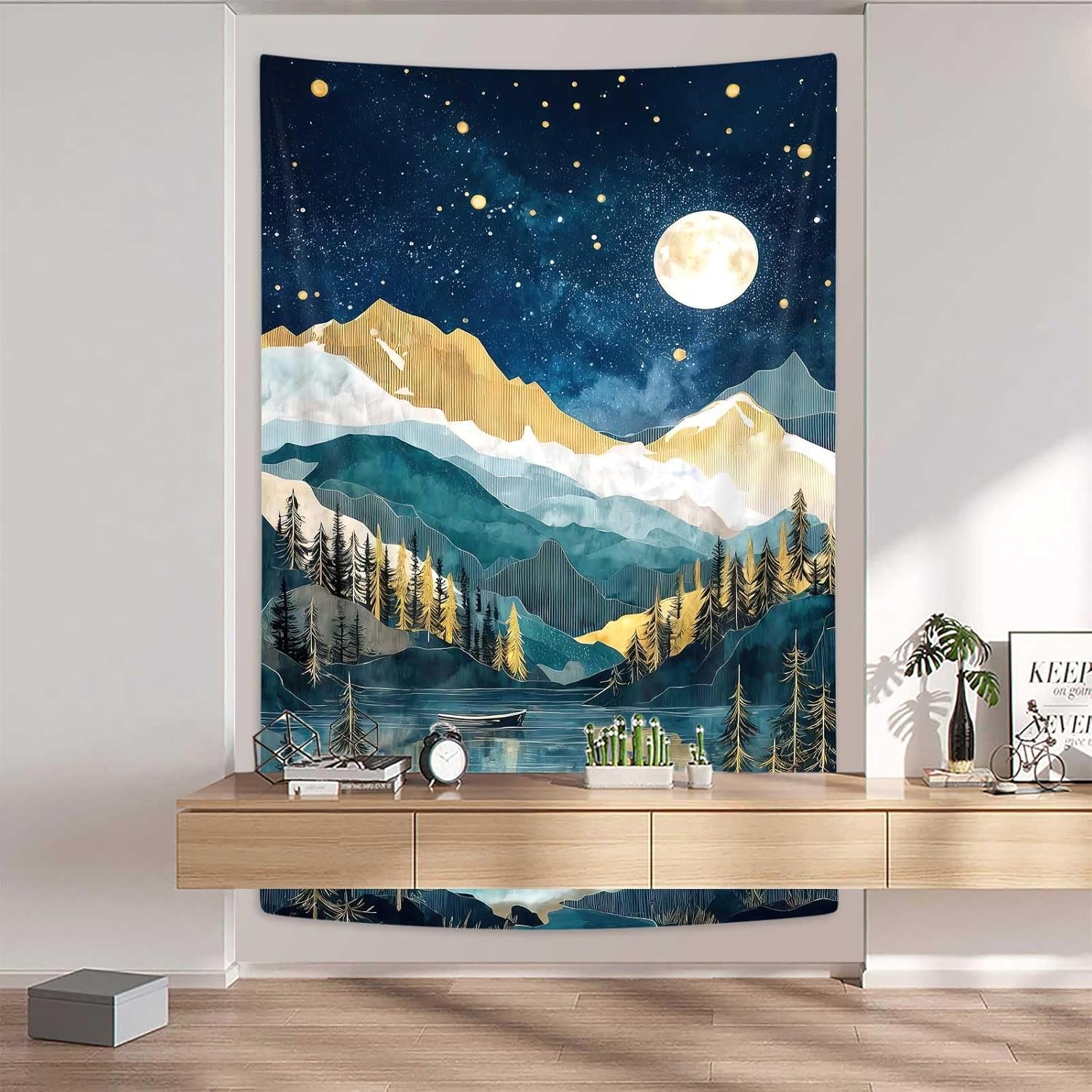 DYNH Boho Mountain Vertical Tapestry, Nature Forest Tree Lake Moon Tapestries, Bohemian Minimalist Mid Century Night Tapestry Wall Hanging for Bedroom College Dorm Asthetic Home Decor,60X80Inches
