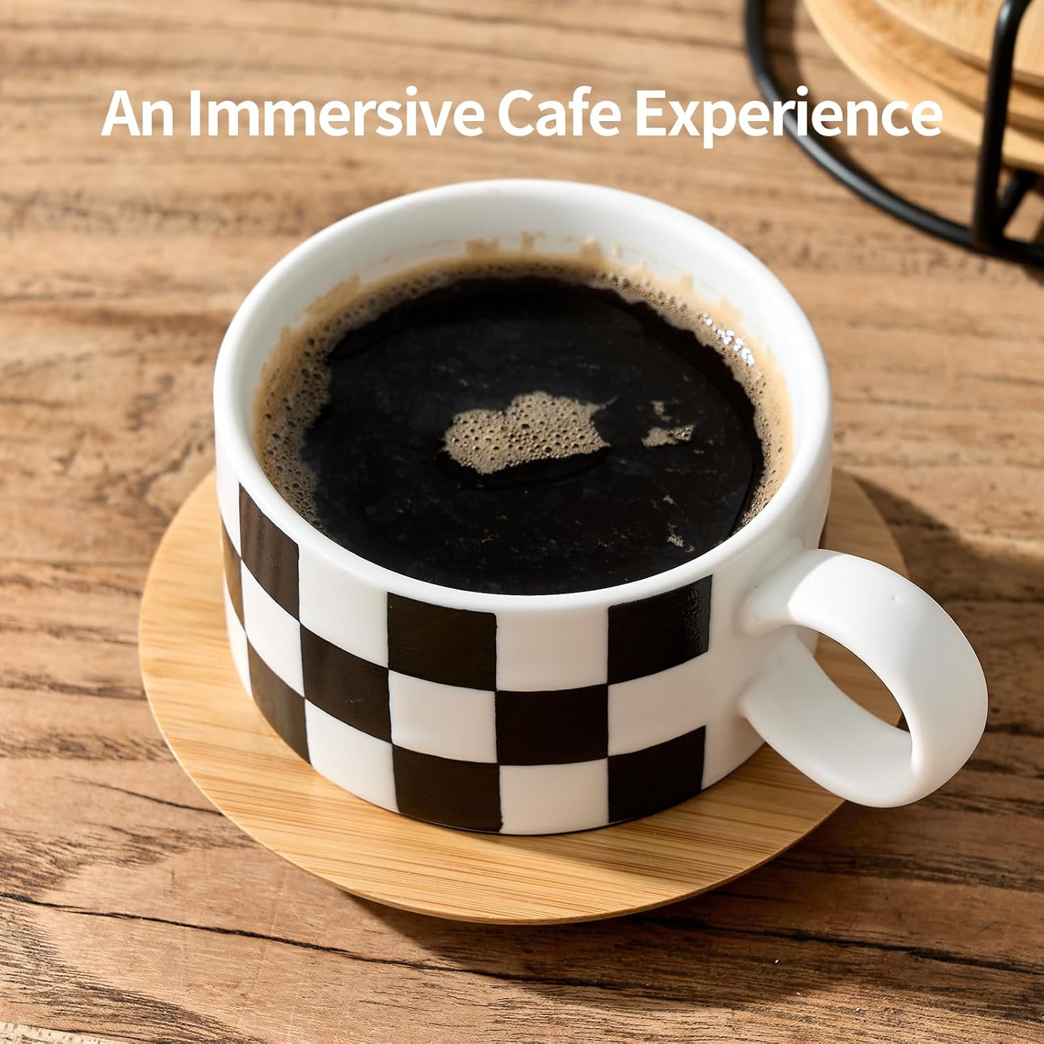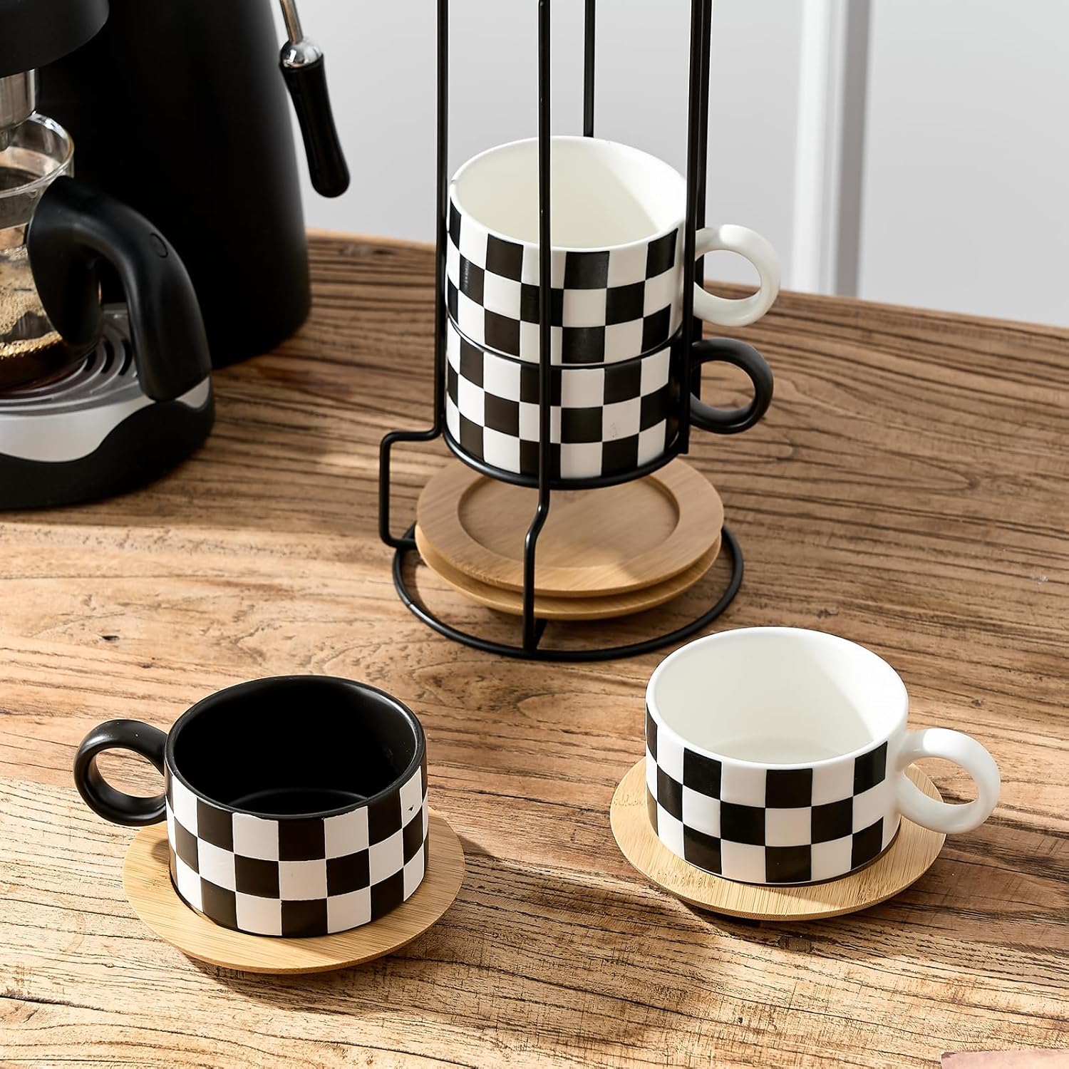 LUKA 6 Ounce Ceramic Stackable Black and White Checkered Espresso Cups with Saucers and Metal Stand Set of 4, Cappuccino Cups Set for Coffee Drinks, Latte, Cafe Mocha and Tea