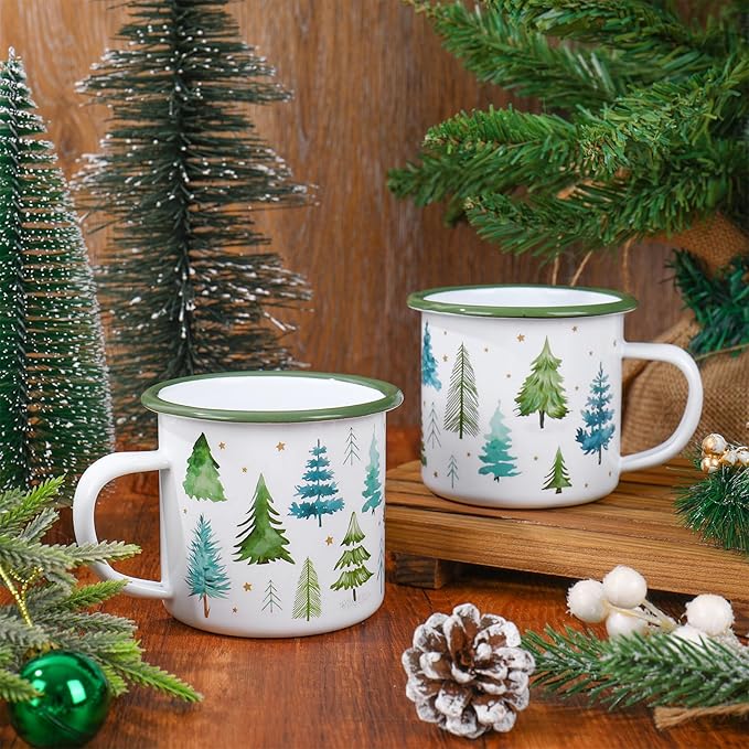 Whaline 2Pcs Christmas Mini Coffee Mugs 12oz Enamel Cup with Handle Watercolor Xmas Tree Forest Drinking Mug for Winter Holiday Birthday Party Favor Supplies
