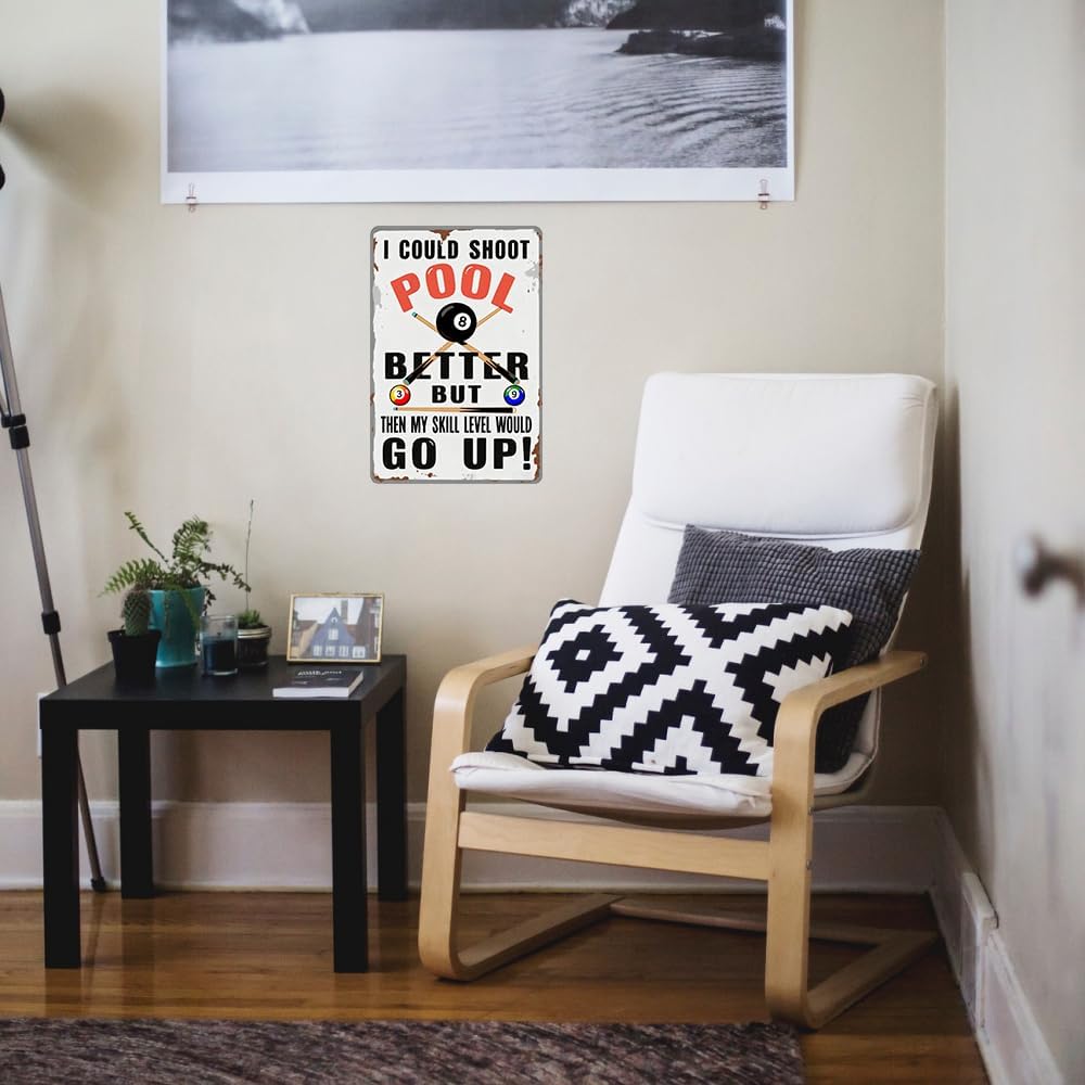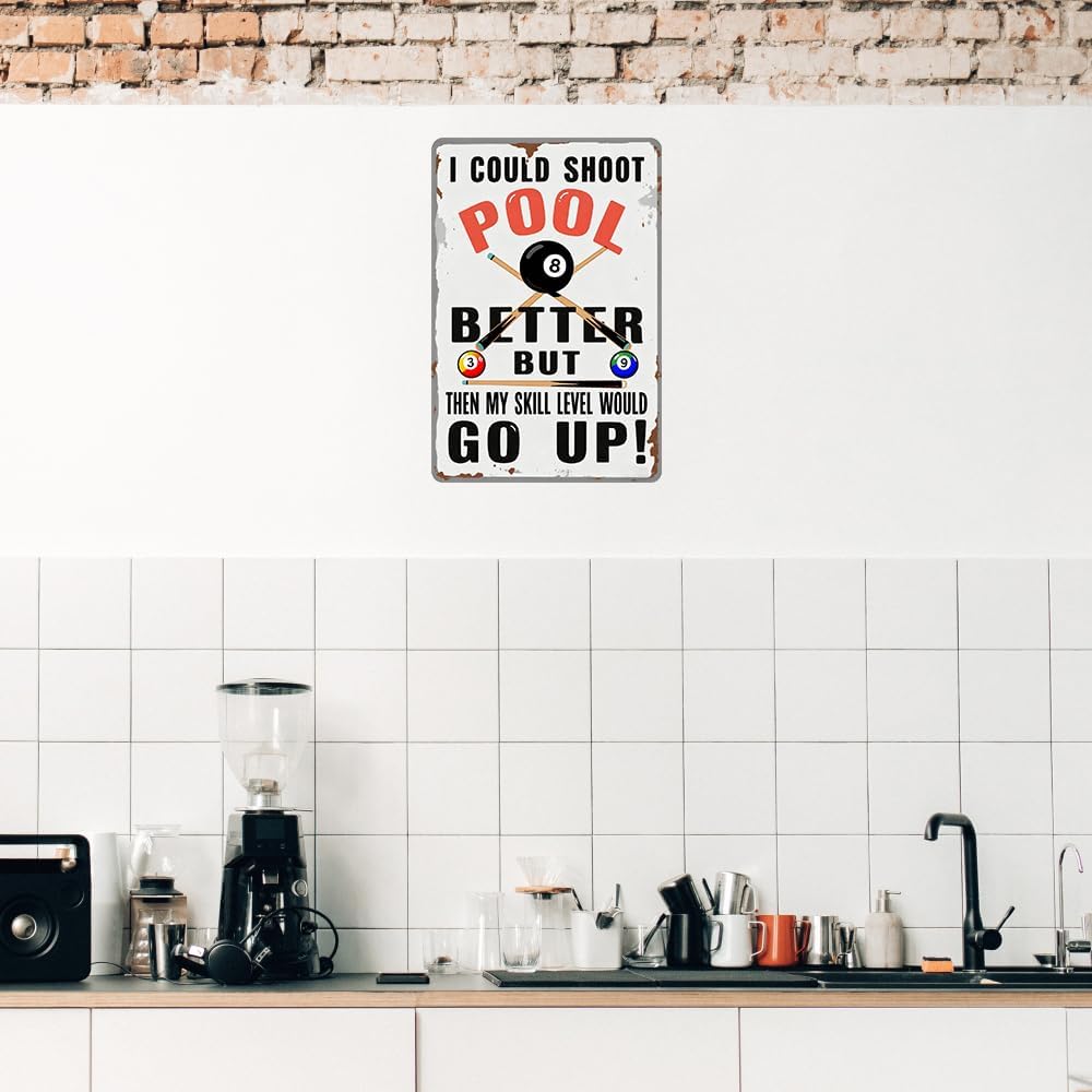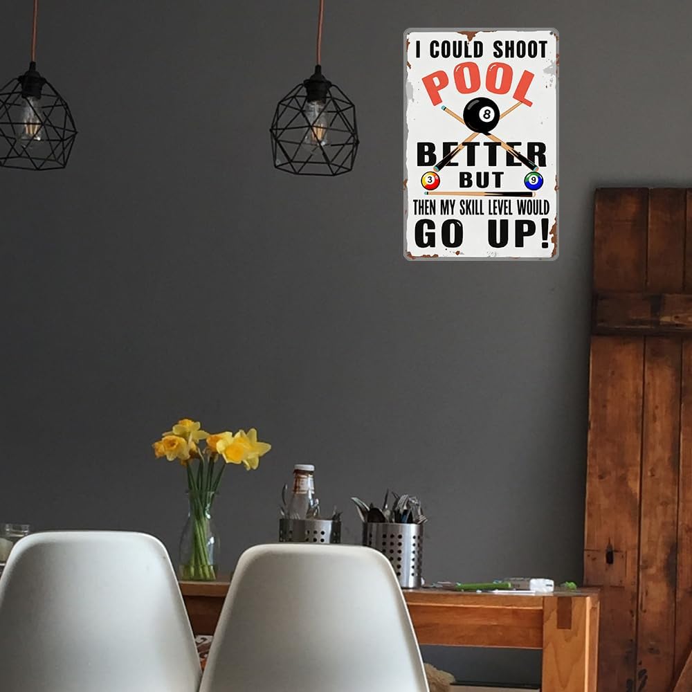 - Humorous Billiards Themed Decor: Add a playful touch to your game room with this funny "I Could Shot Pool Better" metal tin sign. Its lighthearted message and retro design create a relaxed, entertaining atmosphere billiards enthusiasts and social spaces.