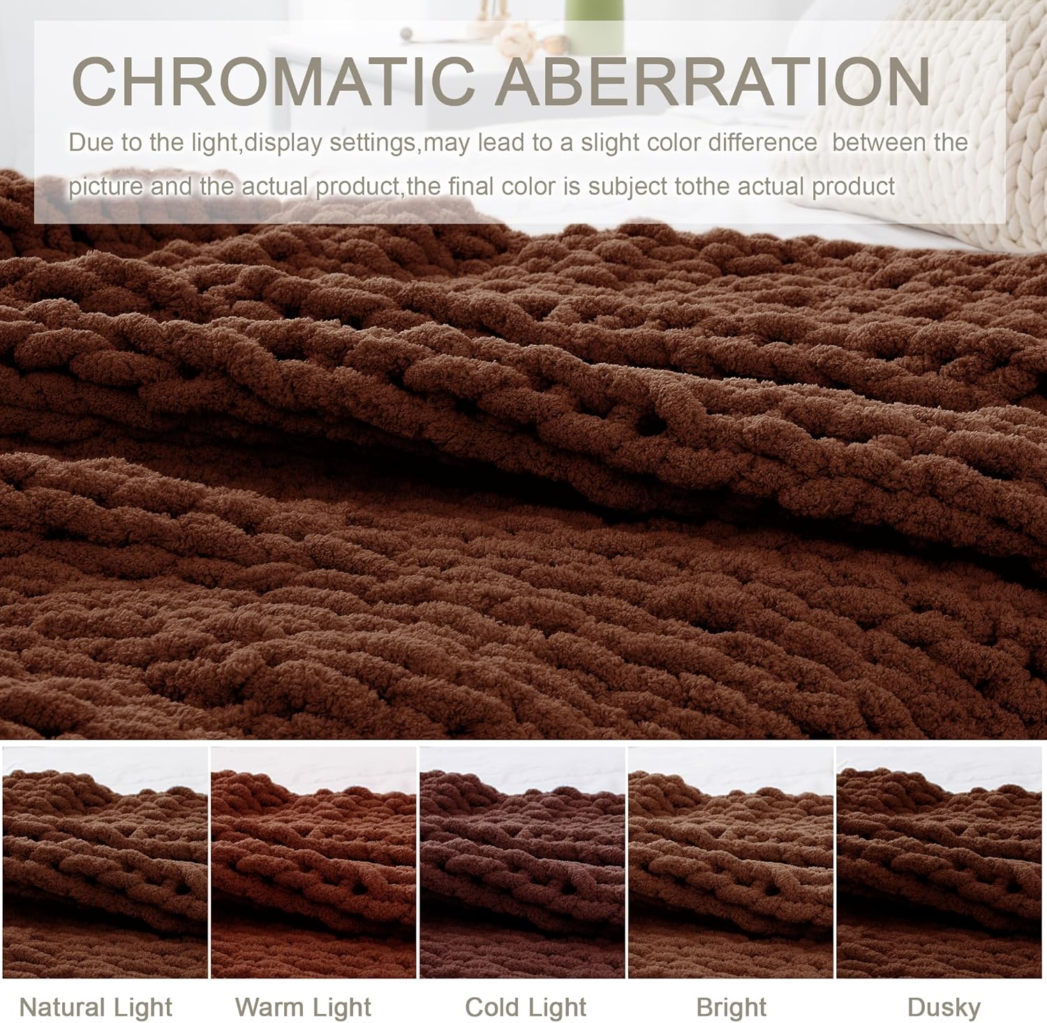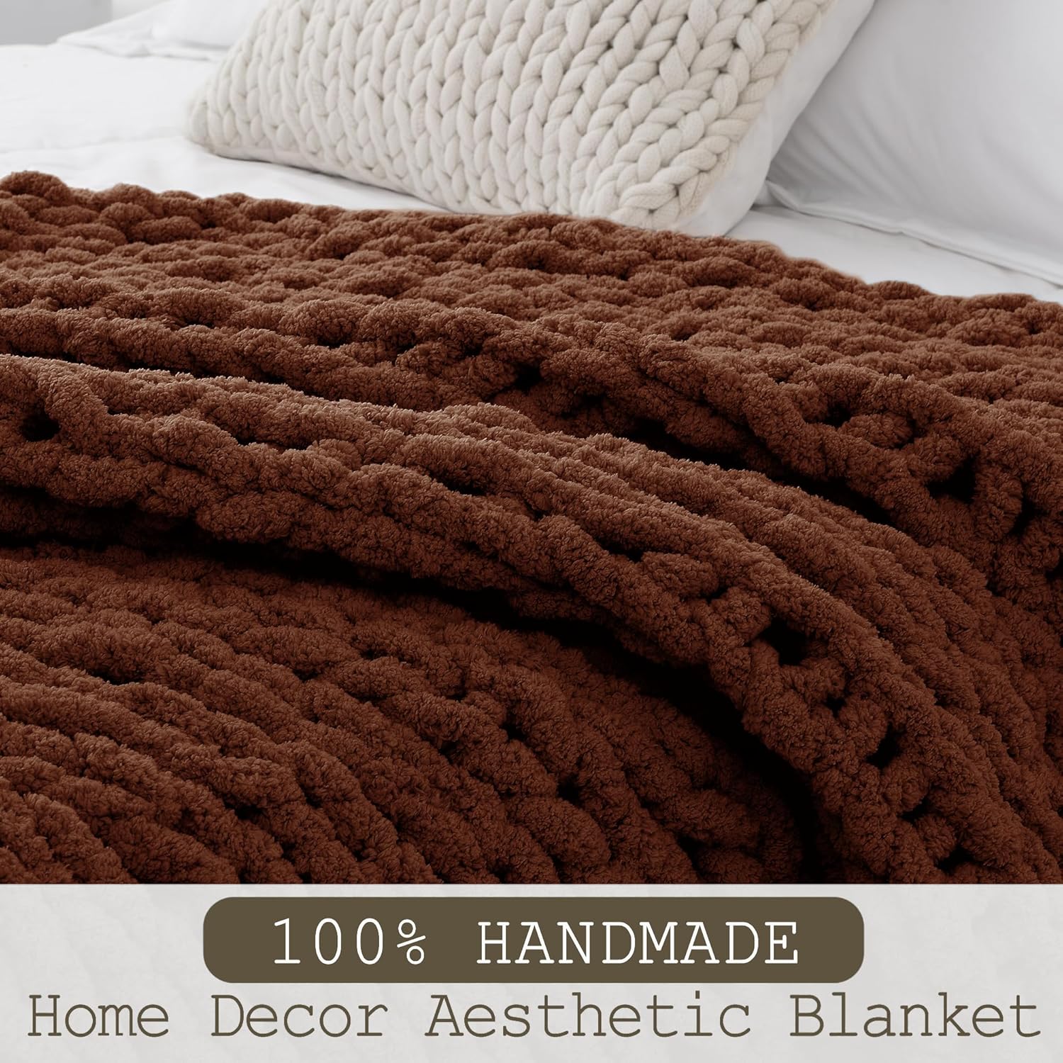 Chunky Knit Throw Blanket 60"X 80", 100% Handmade with Soft Chenille Yarn, 6.7lbs Thick Cable Knitted Blankets, Large Rope Knot Crochet Throws for Couch Sofa Bed Home Decor, Dark Brown