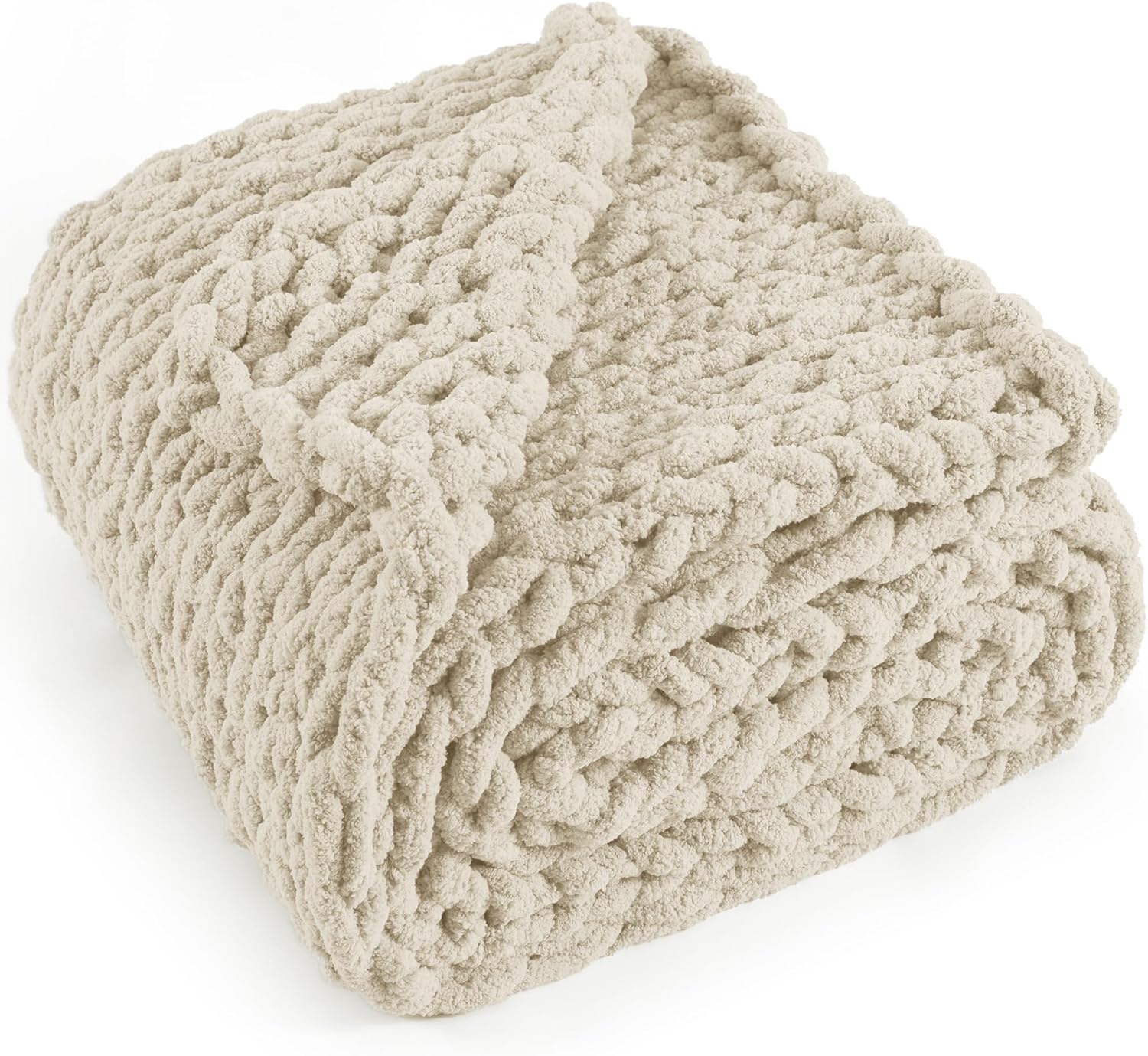 Chunky Knit Throw Blanket 60"X 80", 100% Handmade with Soft Chenille Yarn, 6.7lbs Thick Cable Knitted Blankets, Large Rope Knot Crochet Throws for Couch Sofa Bed Home Decor, Beige