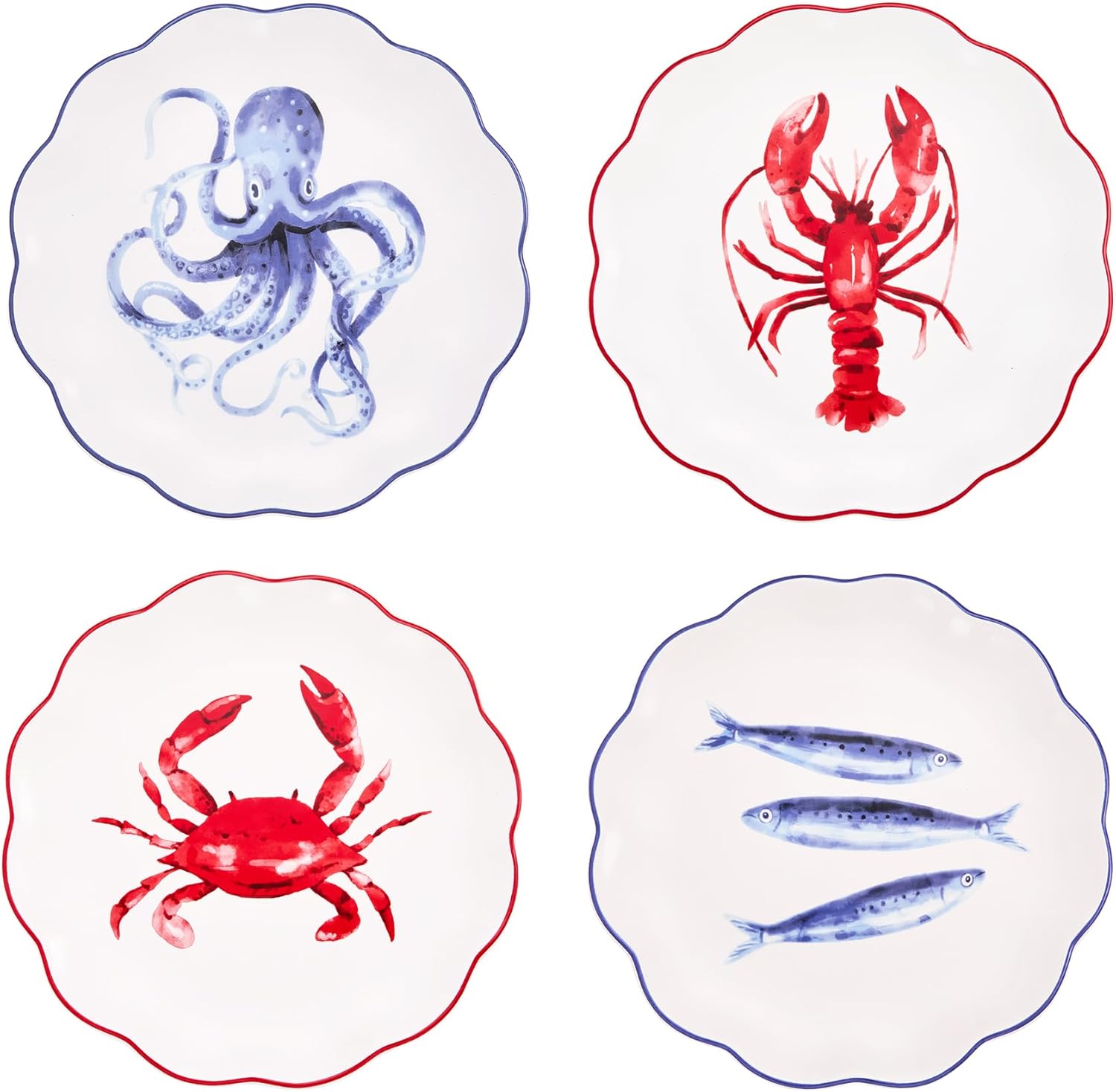 Bico Ocean Wonders Scalloped Salad Plates Set of 4, 8.75 Inch Ceramic Dessert Plates for Salad, Appetizer, Side Dishes, Microwave and Dishwasher Safe, Gift for Housewarming and Christmas