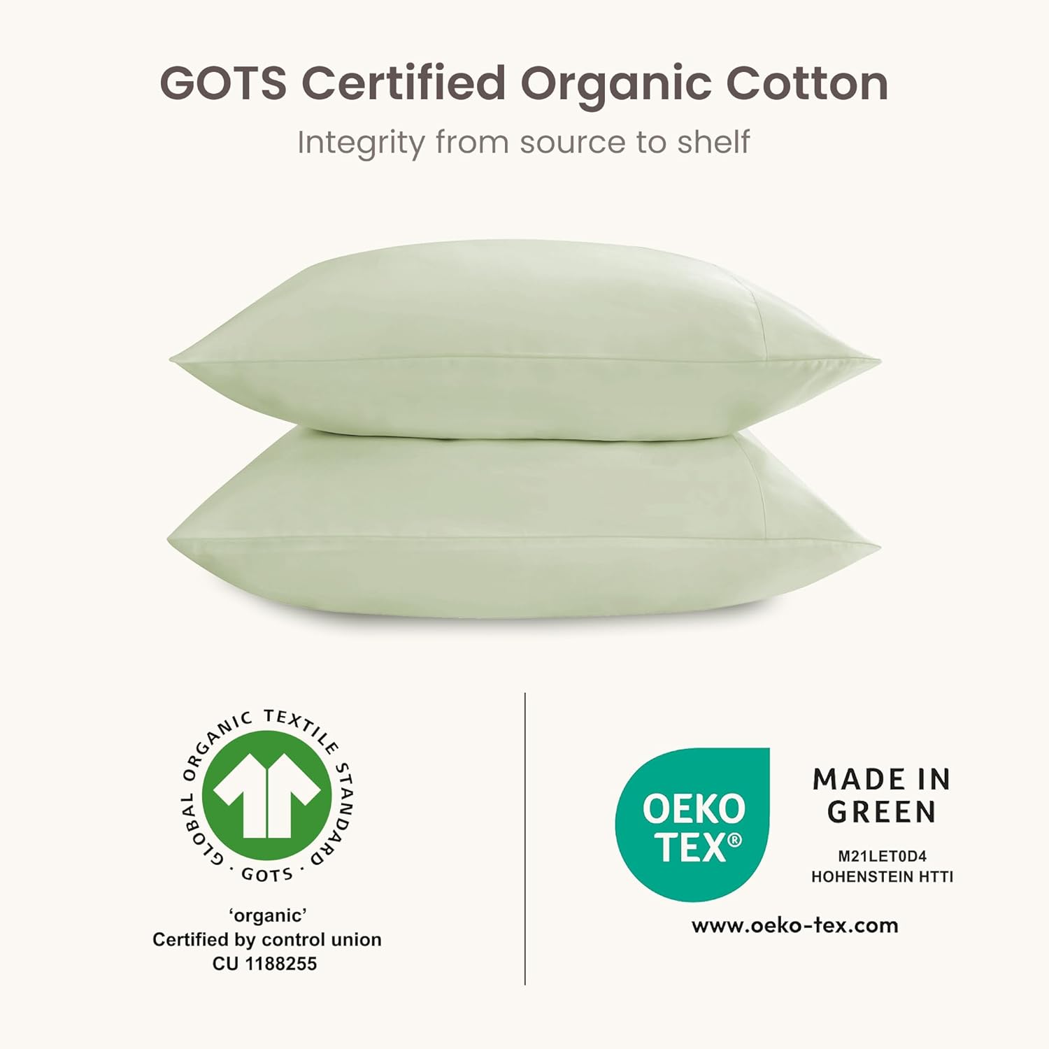 Bioweaves 100% Organic Cotton Envelope Pillow Cases 300 Thread Count Soft Sateen Weave GOTS Certified – 20 X 37, Set of 2, Pastel Green