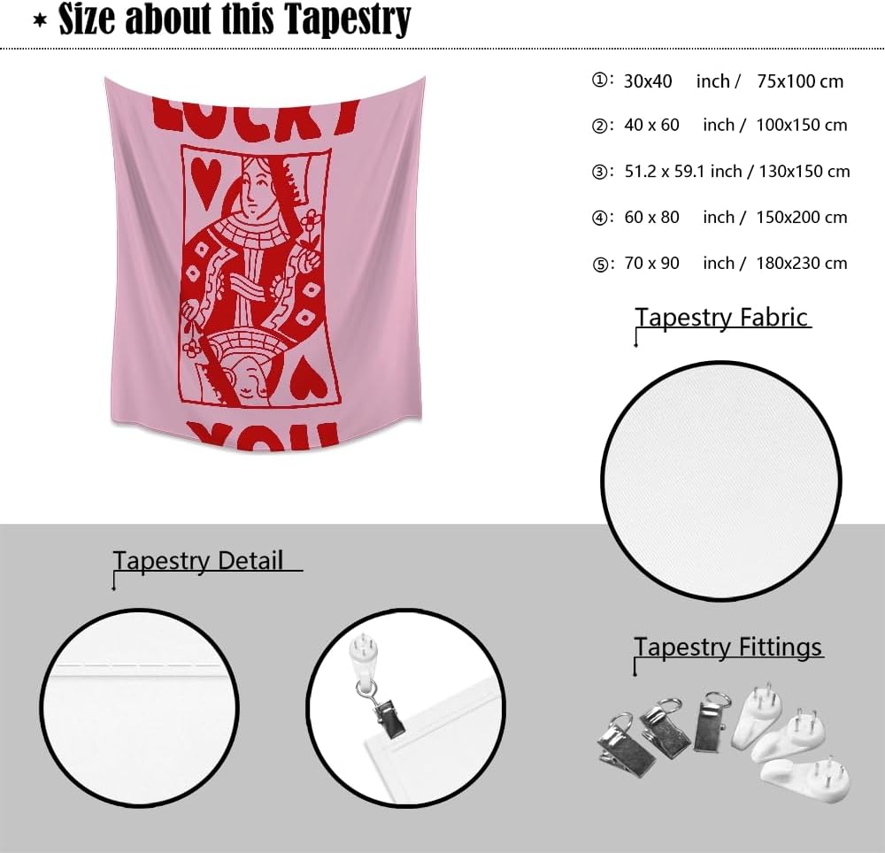 Medpol Retro Lucky You Playing Card Tapestry, Pink Queen of Hearts Wall Hanging, Funky Poker Aesthetic Decor for College Dorm Bedroom Living Room 60x90inch